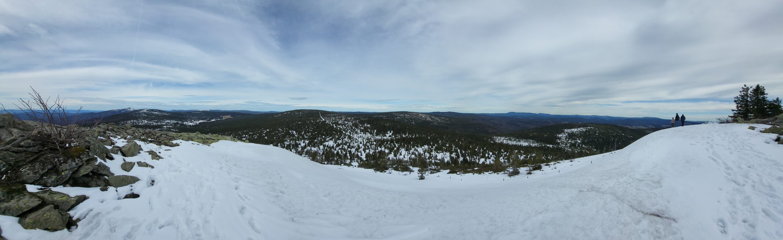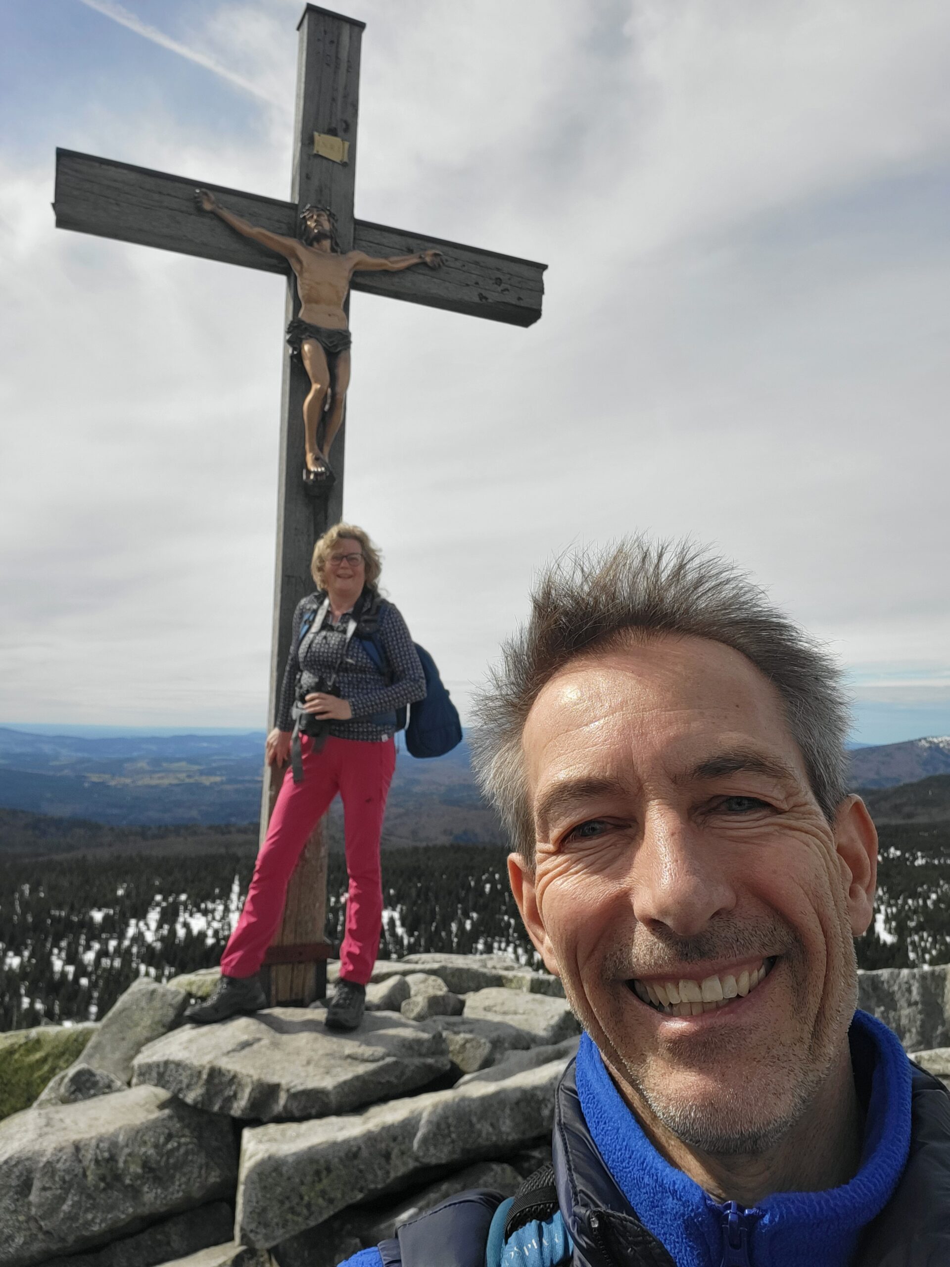 Über unzählige Stufen steigen wir zum Gipfelkreuz empor. Der Ausblick ist atemberaubend: die Weite des Waldes, die sanften Hügel der Böhmischen Seite und die steil abfallenden Hänge der Bayrischen Seite. Unser Vesper, das wir mitgebracht haben, genießen wir am Gipfel.