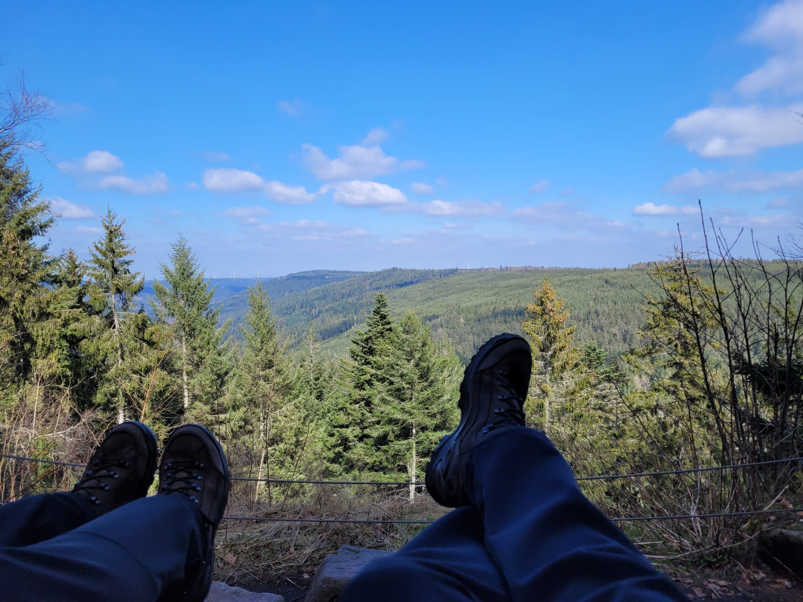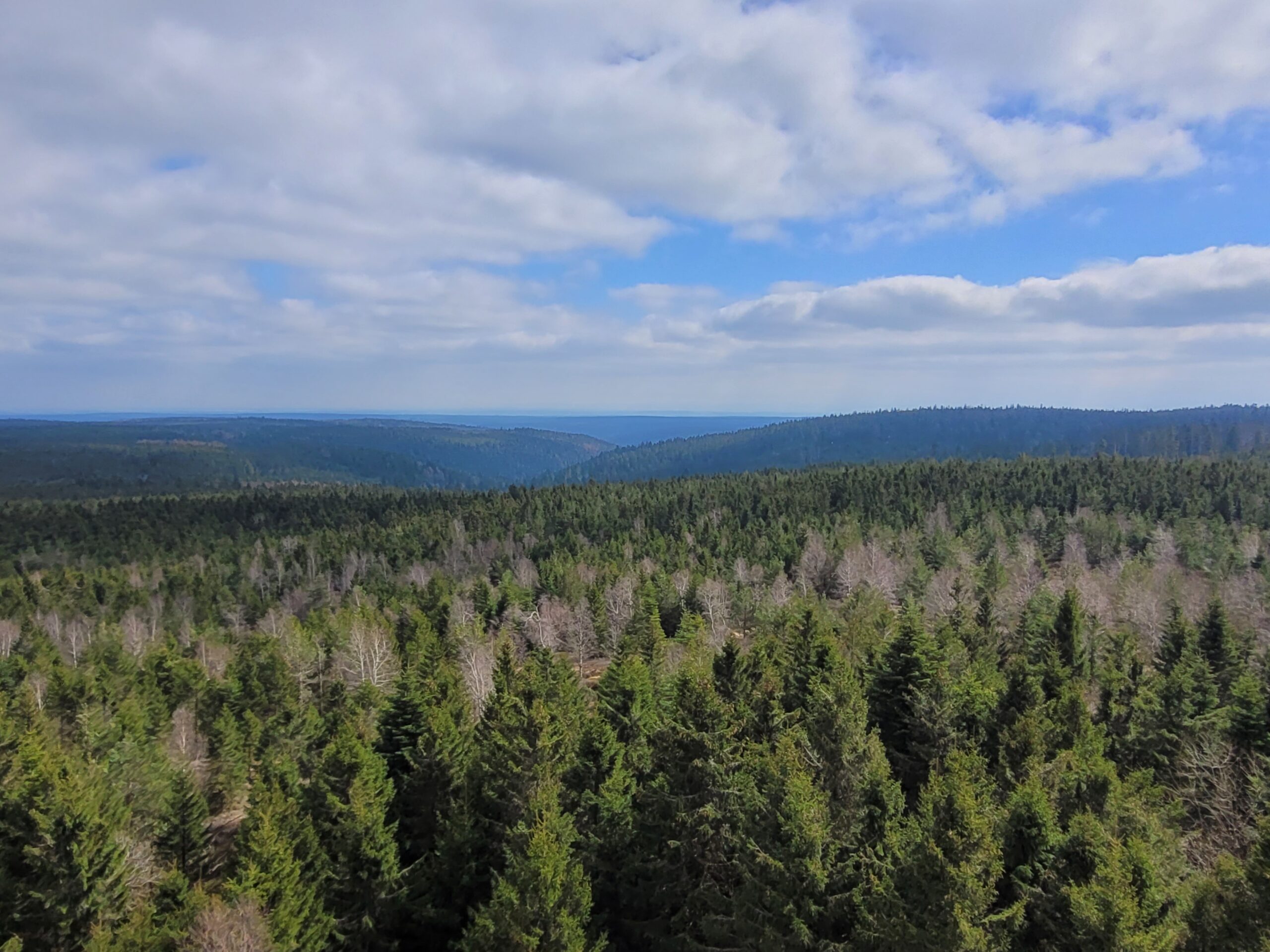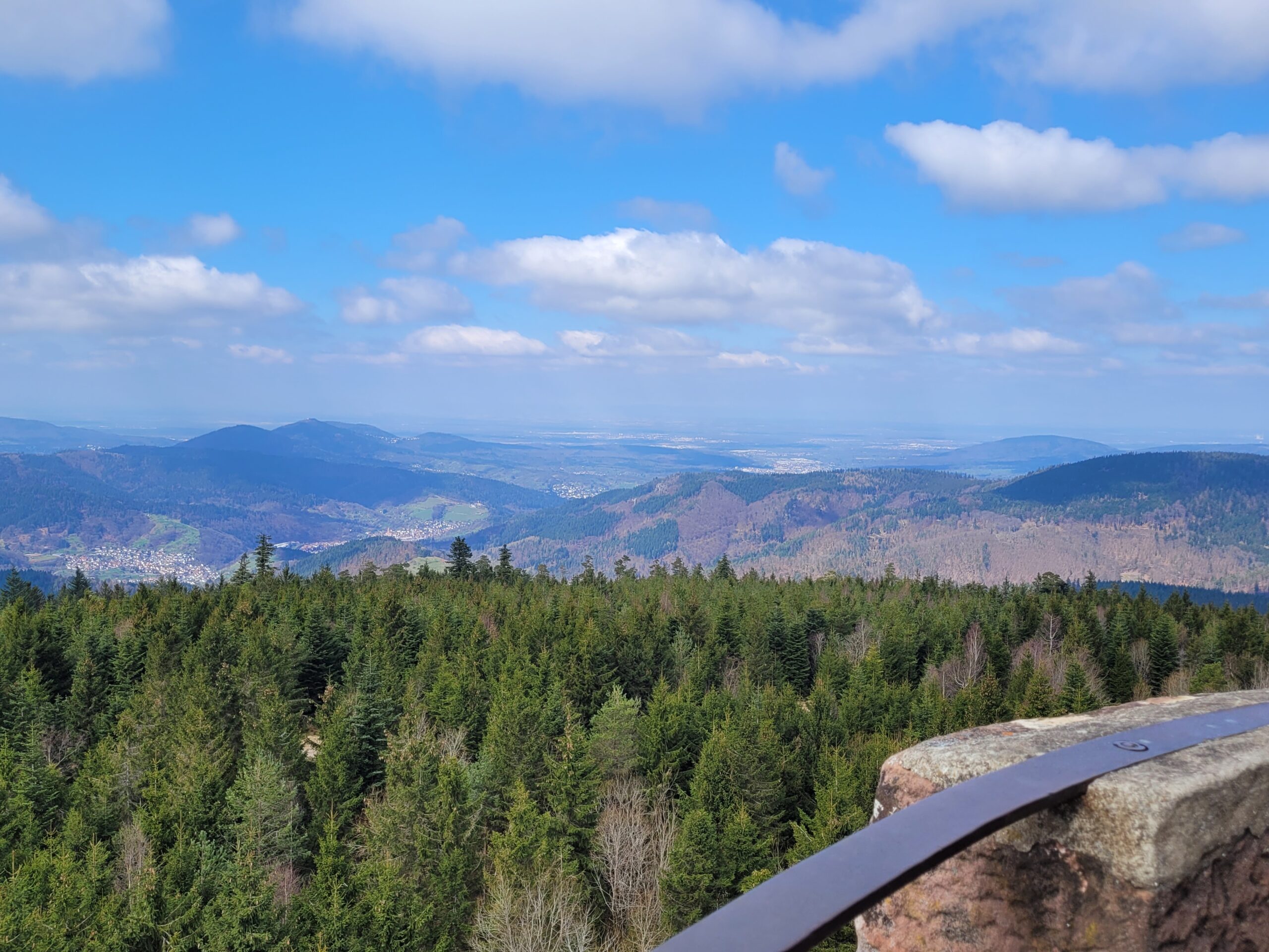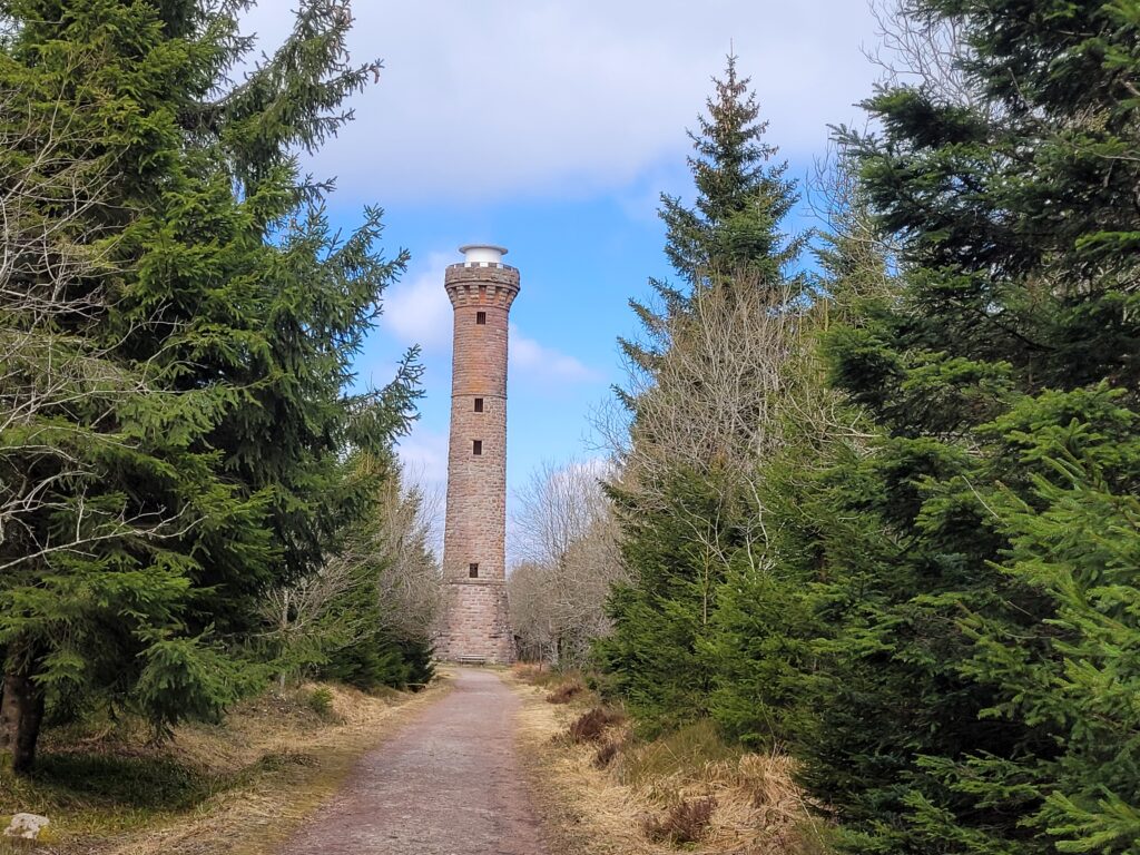 Bald darauf erreichen wir den Hohlohturm. Schon von Weitem ist der historische Steinturm sichtbar, der in der Kaiserzeit erbaut wurde. Oben angekommen, erwartet uns ein fantastischer Rundumblick über den Nordschwarzwald – ein Meer aus Baumwipfeln, das sich bis zum Horizont erstreckt.