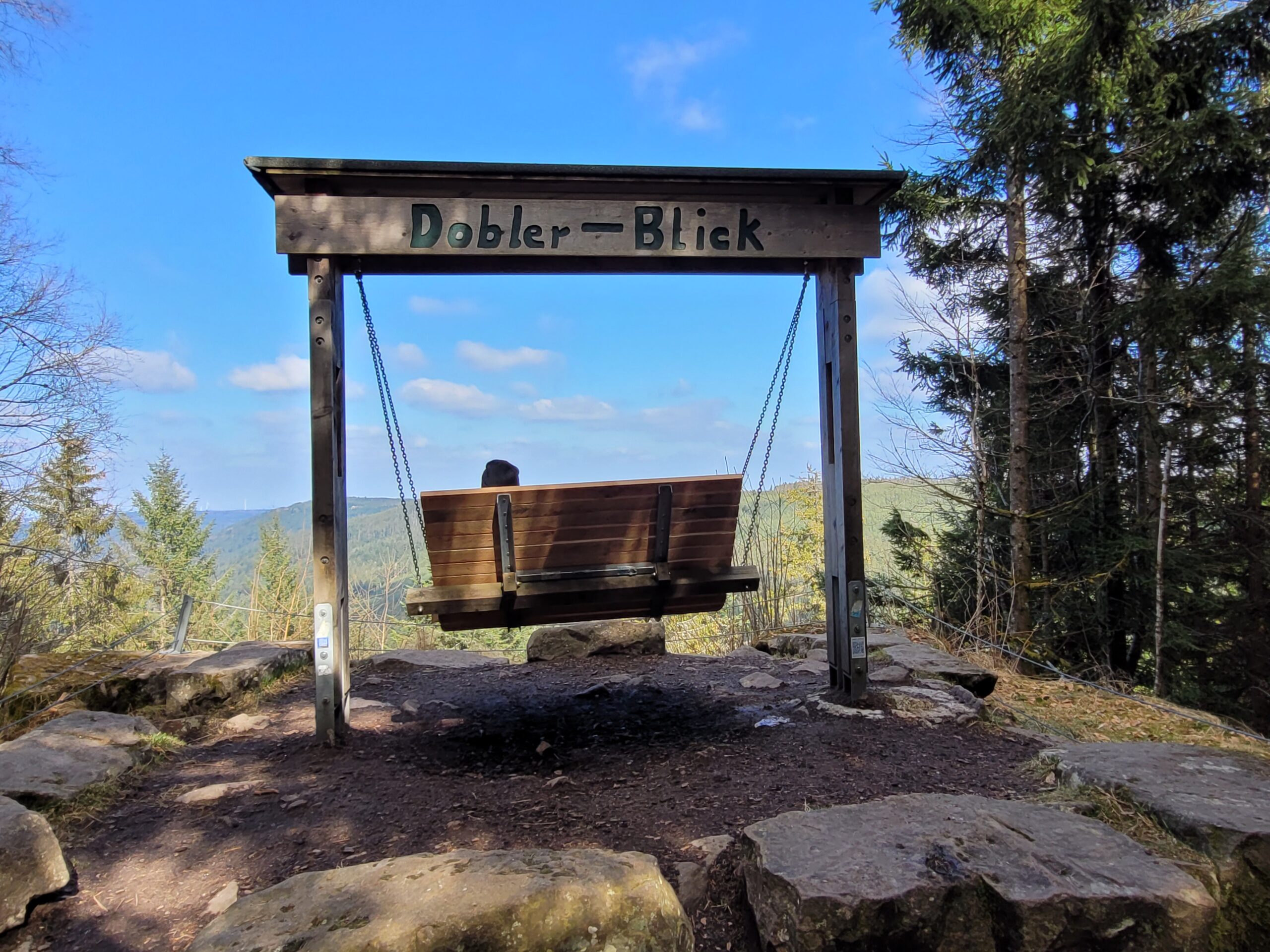 Beim Dobler Ausblick angekommen, werden wir von einer großen Holz-Liegeschaukel überrascht – ideal, um kurz innezuhalten. Der Blick schweift über dunkle Wälder und sanfte Hügel.