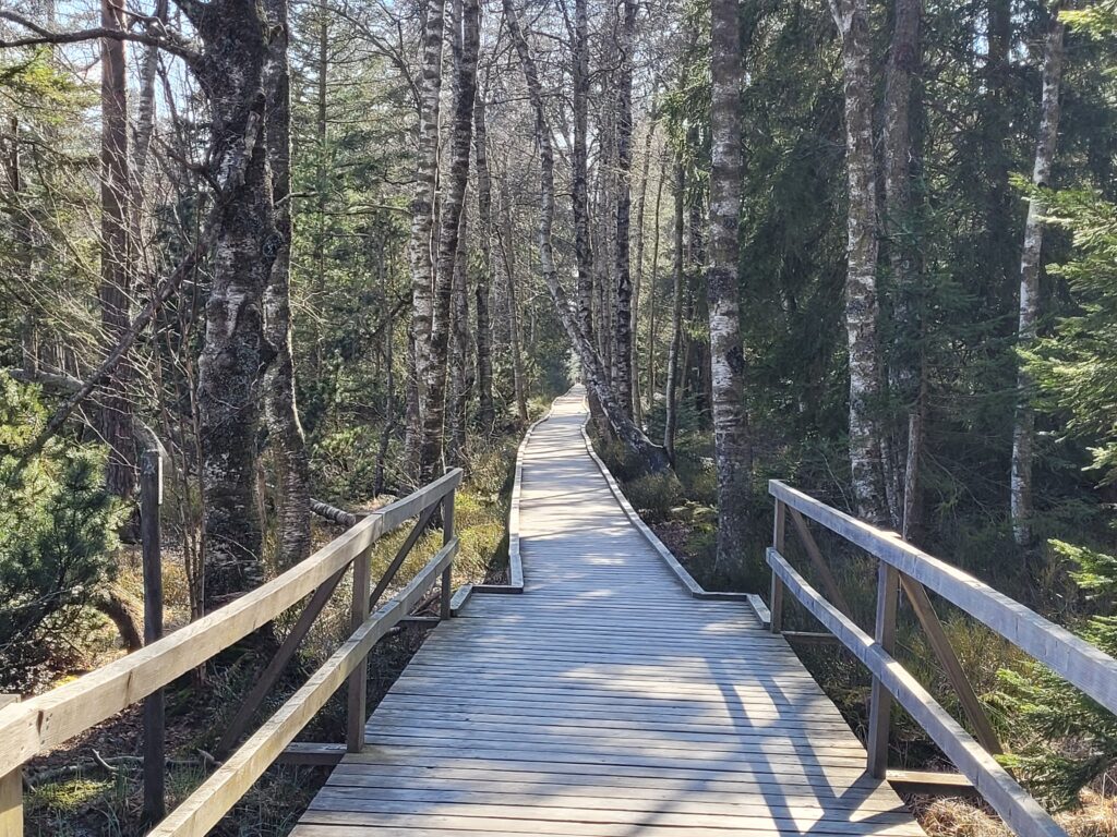 Ein weiteres Highlight wartet noch: Über einen schmalen Holzbohlenpfad gelangen wir direkt ins Hochmoor. Hier können wir die besondere Vegetation und Tierwelt aus nächster Nähe erleben. Einige Bänke laden zum Verweilen ein, und wir beobachten das geschäftige Treiben der Vögel, die in den weiten Moorflächen ihre Nester bauen.