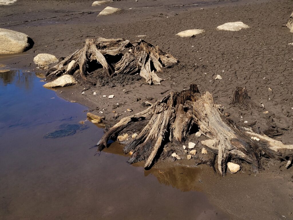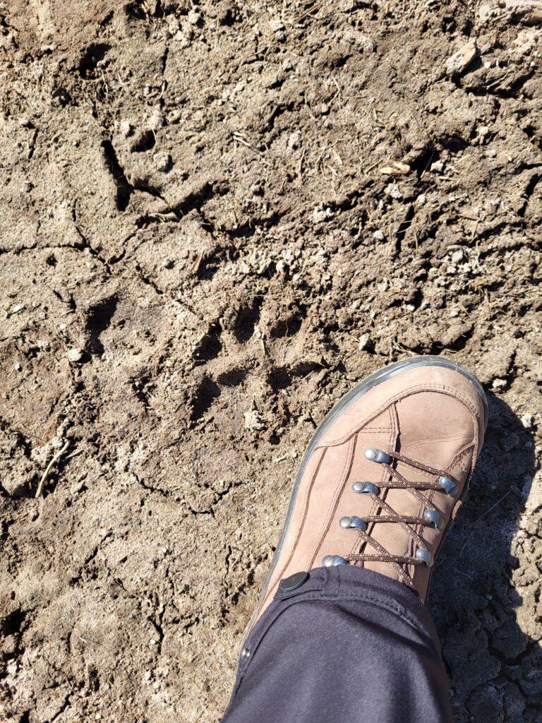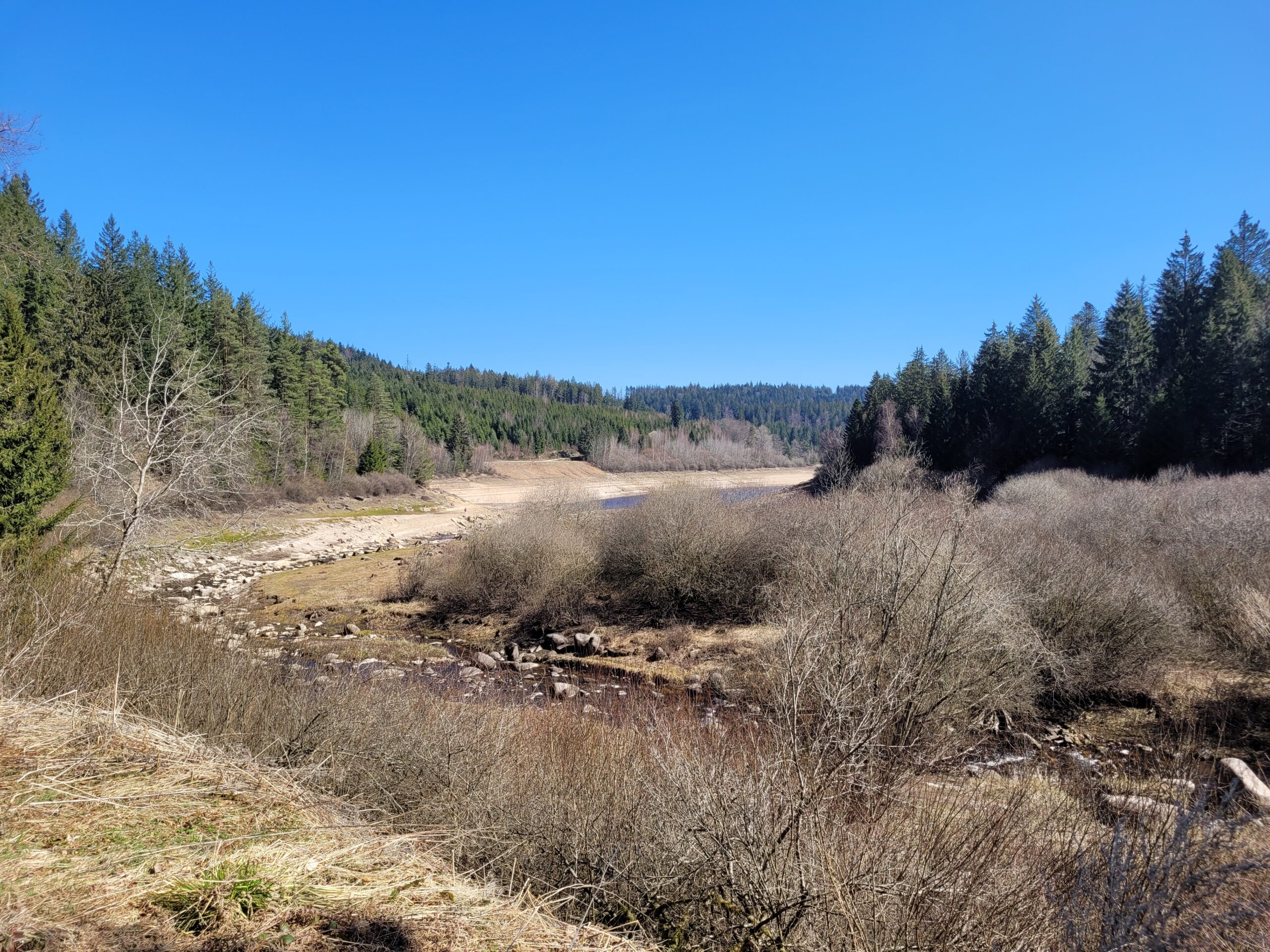 Danach geht es weiter, zurück in Richtung Talsperre. Der Weg führt uns mal direkt am Ufer entlang, mal über kleine Zuflüsse, bei denen wir kreativ werden müssen: Ralf ist mutig, balanciert über glitschige Steine ans andere Ufer – und entdeckt dabei etwas im matschigen Boden. Ein Abdruck. Groß, rundlich. War das… ein Wolf? Oder doch nur ein großer Hund?