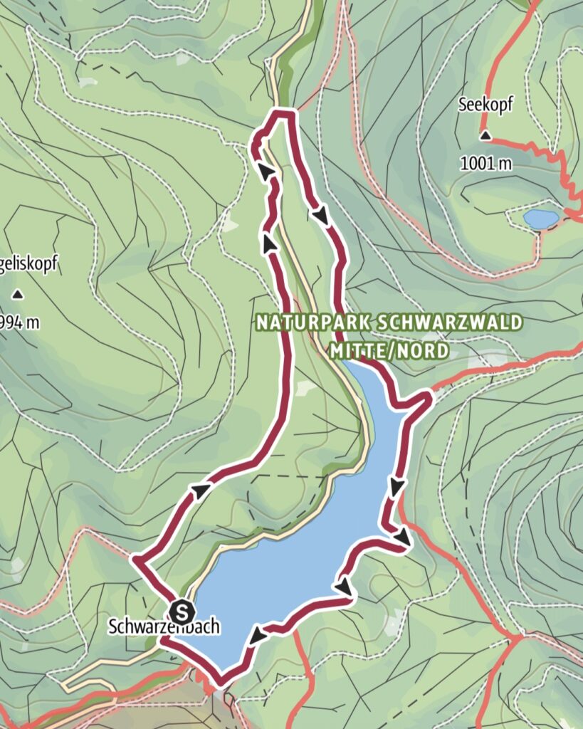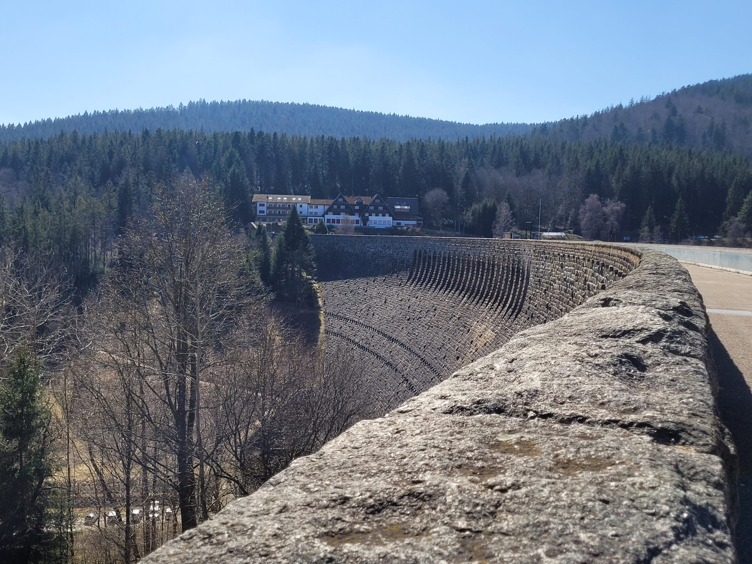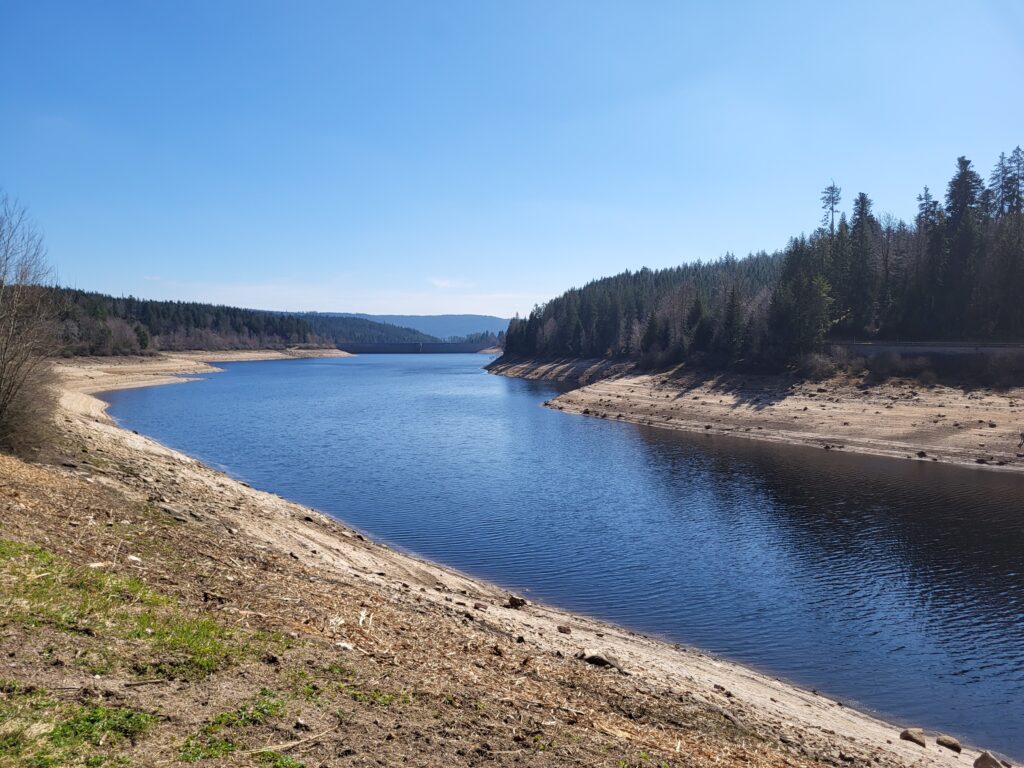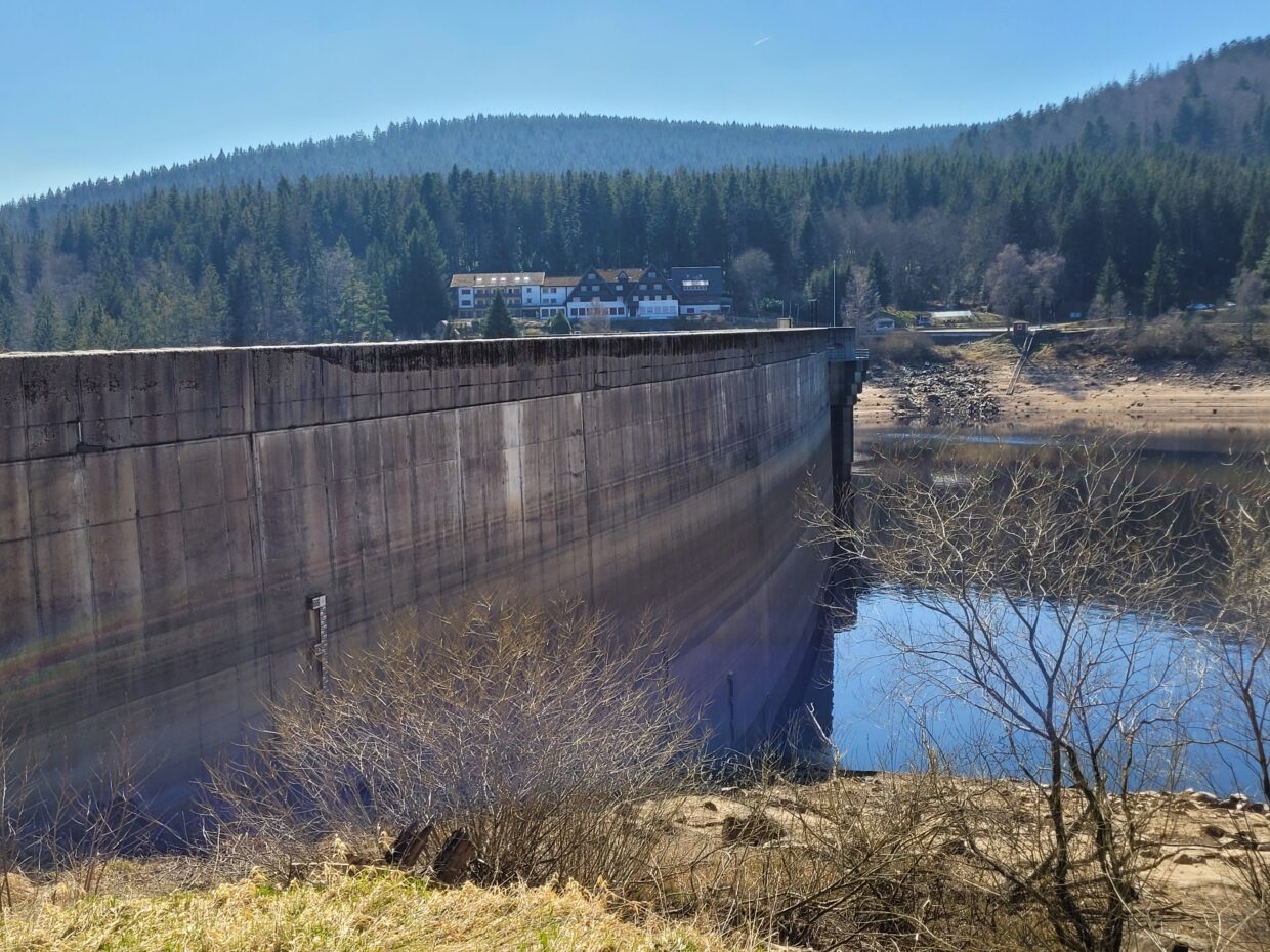 Der Pfad schlängelt sich oberhalb der imposanten Talsperre entlang, begleitet vom leisen Plätschern des Wassers tief unter uns. Bald erreichen wir den Zufluss des Schwarzenbachs.