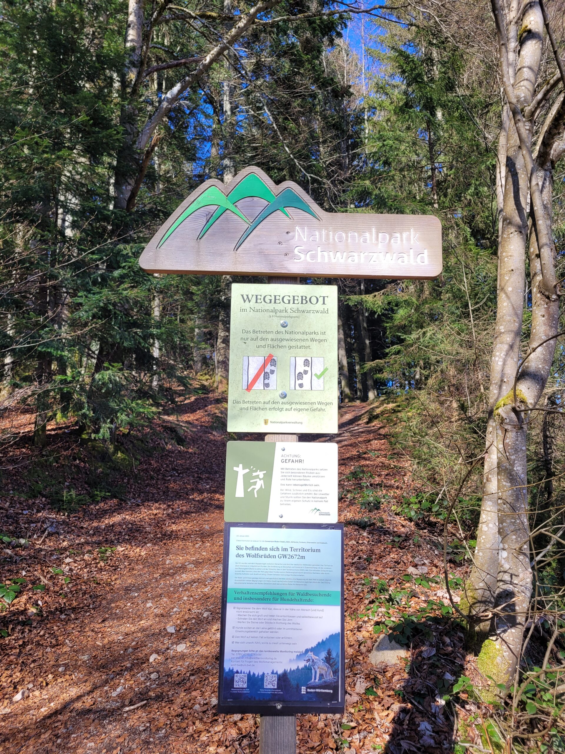 Ein Schild am Wegrand macht uns aufmerksam: Hier lebt ein Wolf. Schlagartig sind wir hellwach. Unsere Stimmen werden leiser, unsere Schritte bedachter. Vielleicht – mit etwas Glück – zeigt sich das scheue Tier.