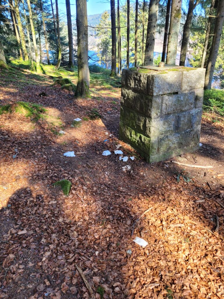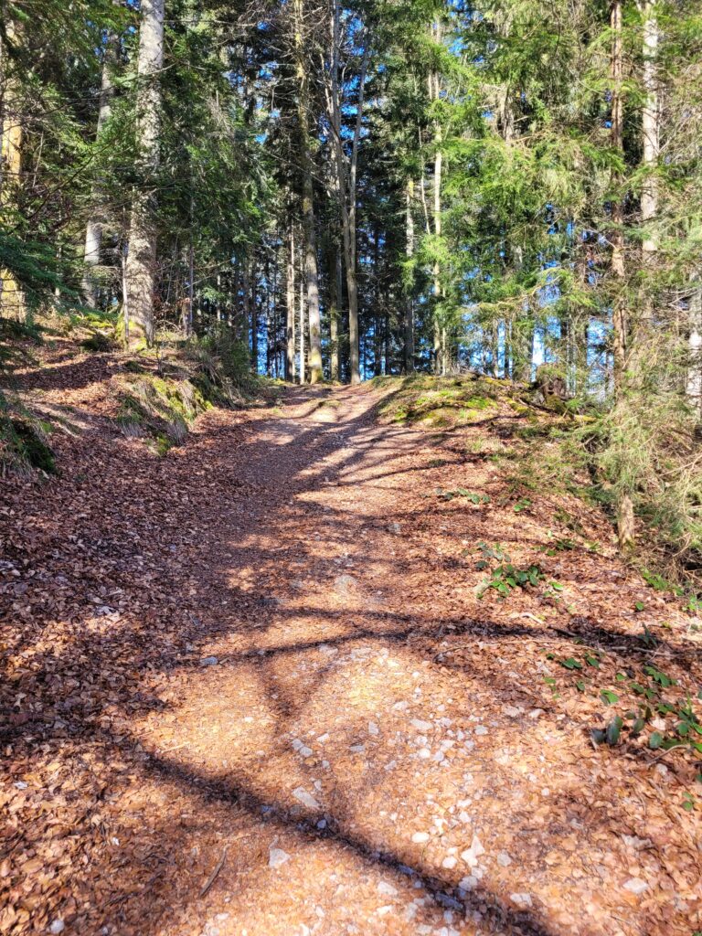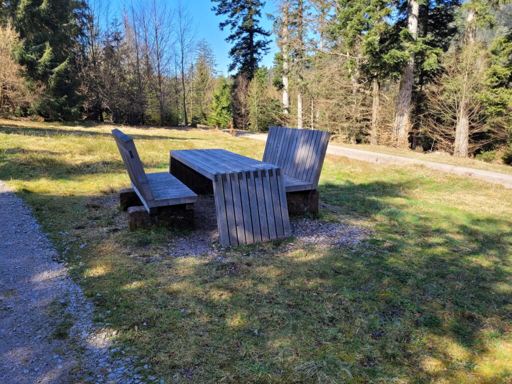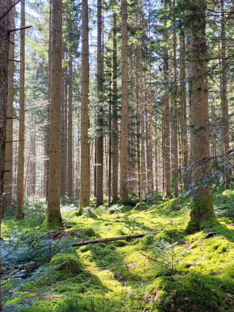 Am Abzweig zum Friedwald legen wir eine Pause ein – mitten im Grünen, mit dem Duft von feuchtem Moos und harzigem Holz in der Nase.