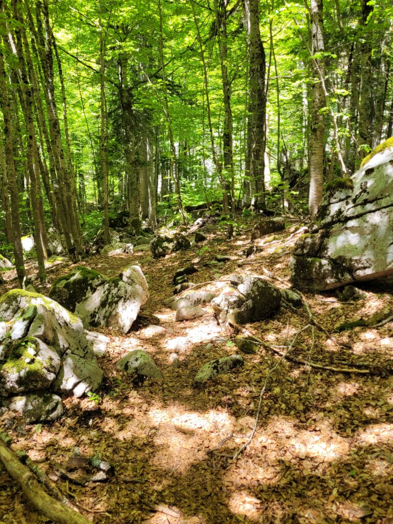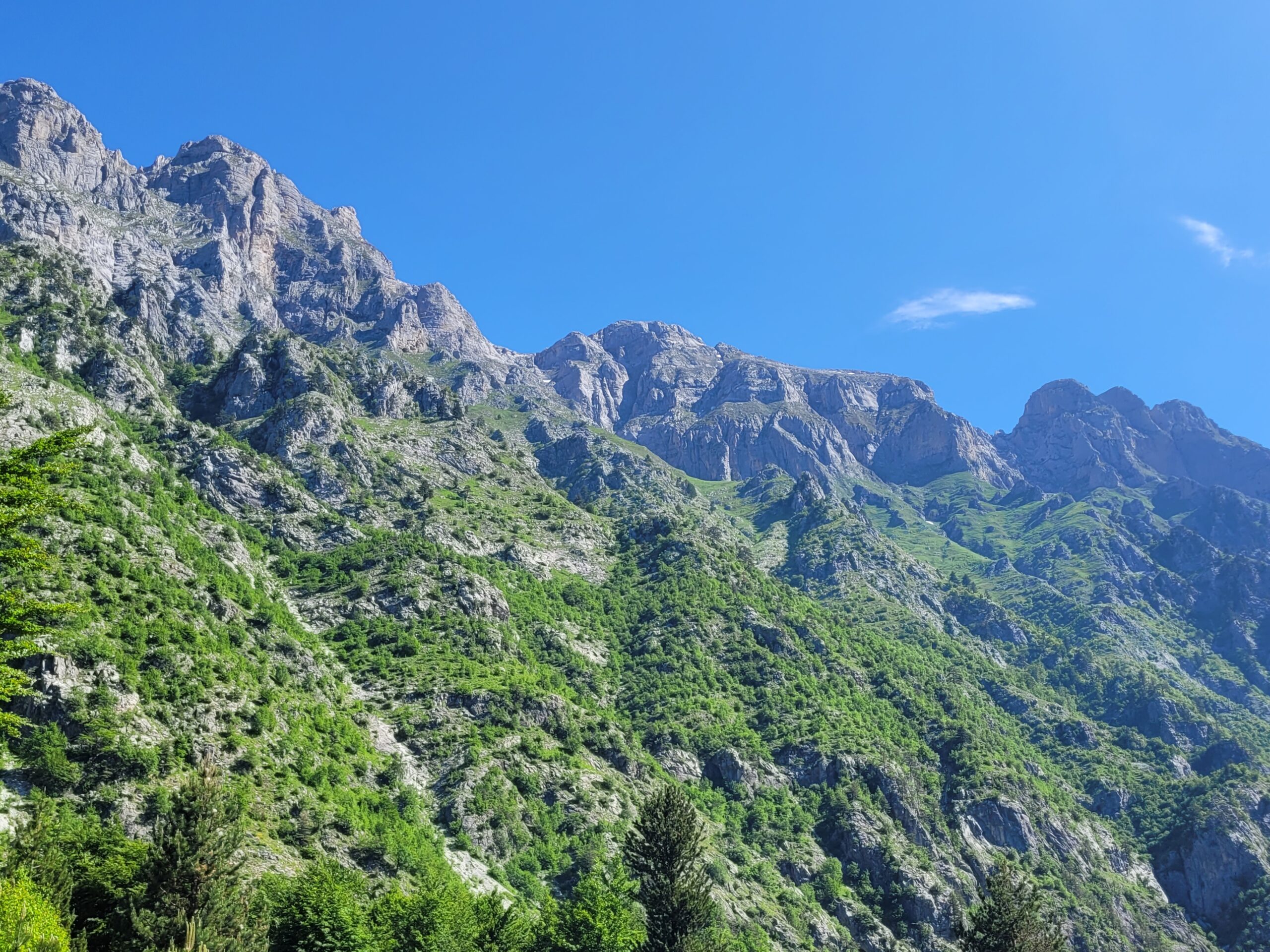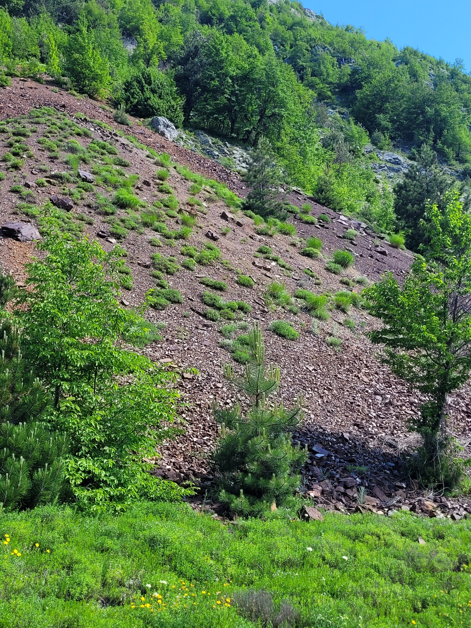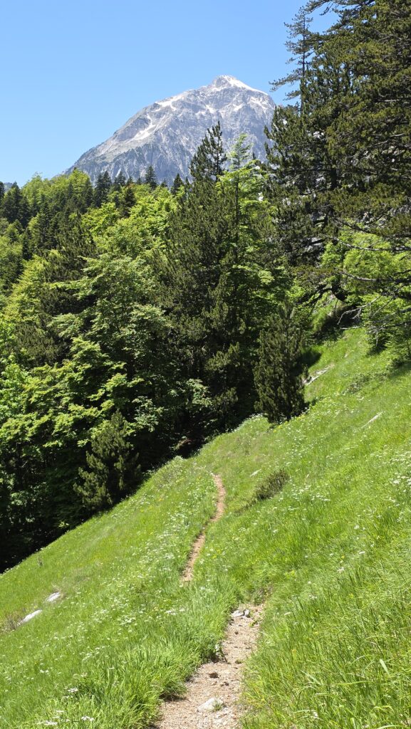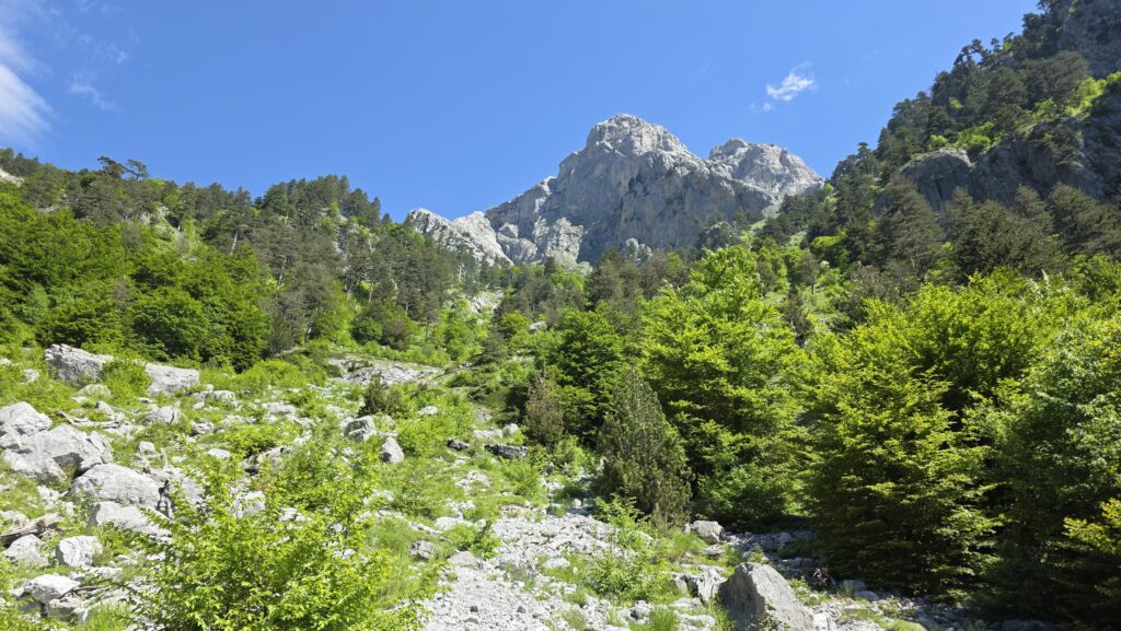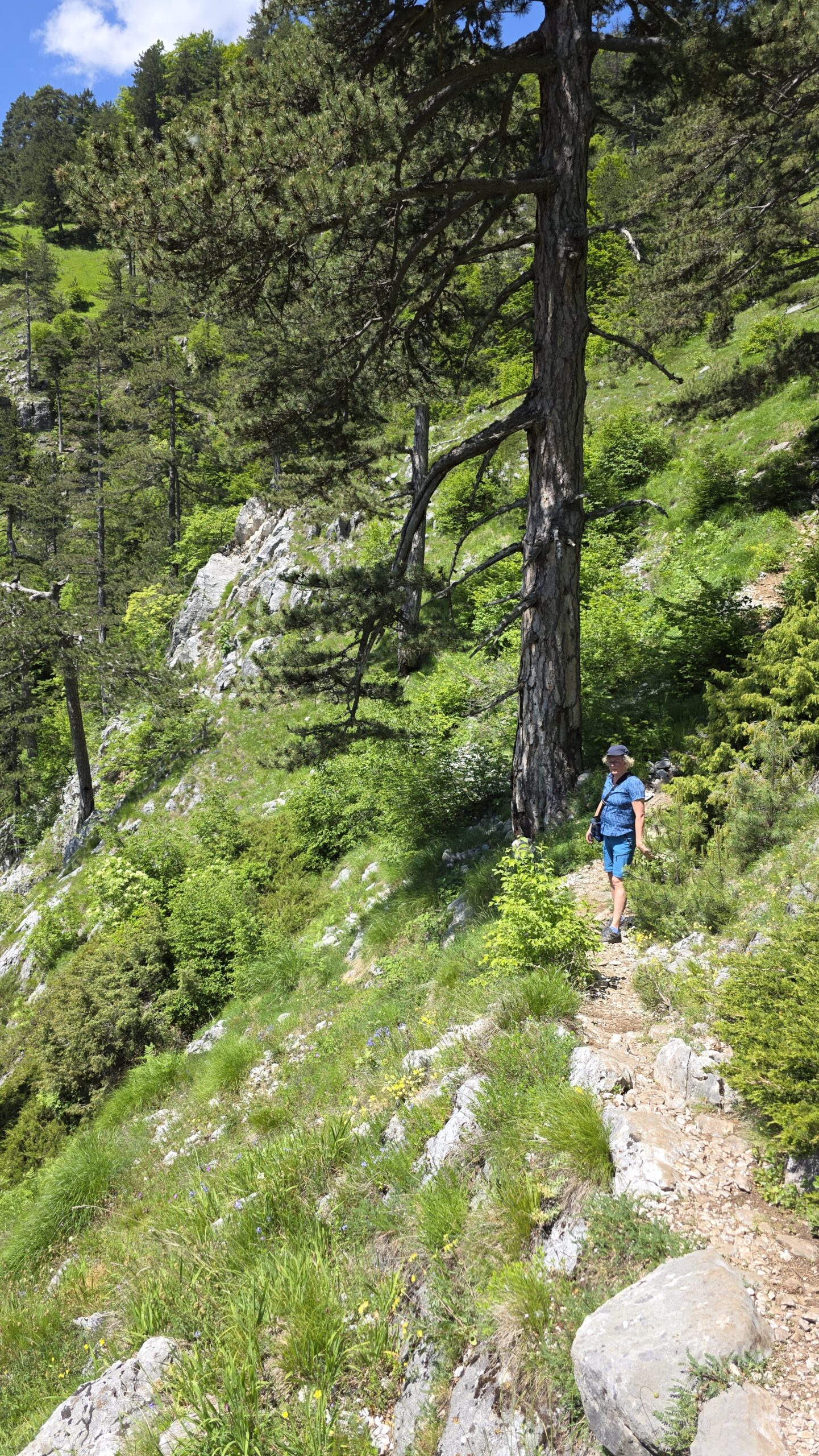 Schon nach kurzer Zeit zieht der Pfad spürbar an. Über Geröllfelder geht es stetig bergauf und in der prallen Sonne wird schnell klar: Diese Wanderung hat es in sich. Zum Glück führt der Weg bald in den Wald, wo es etwas kühler ist – steil bleibt es allerdings trotzdem.