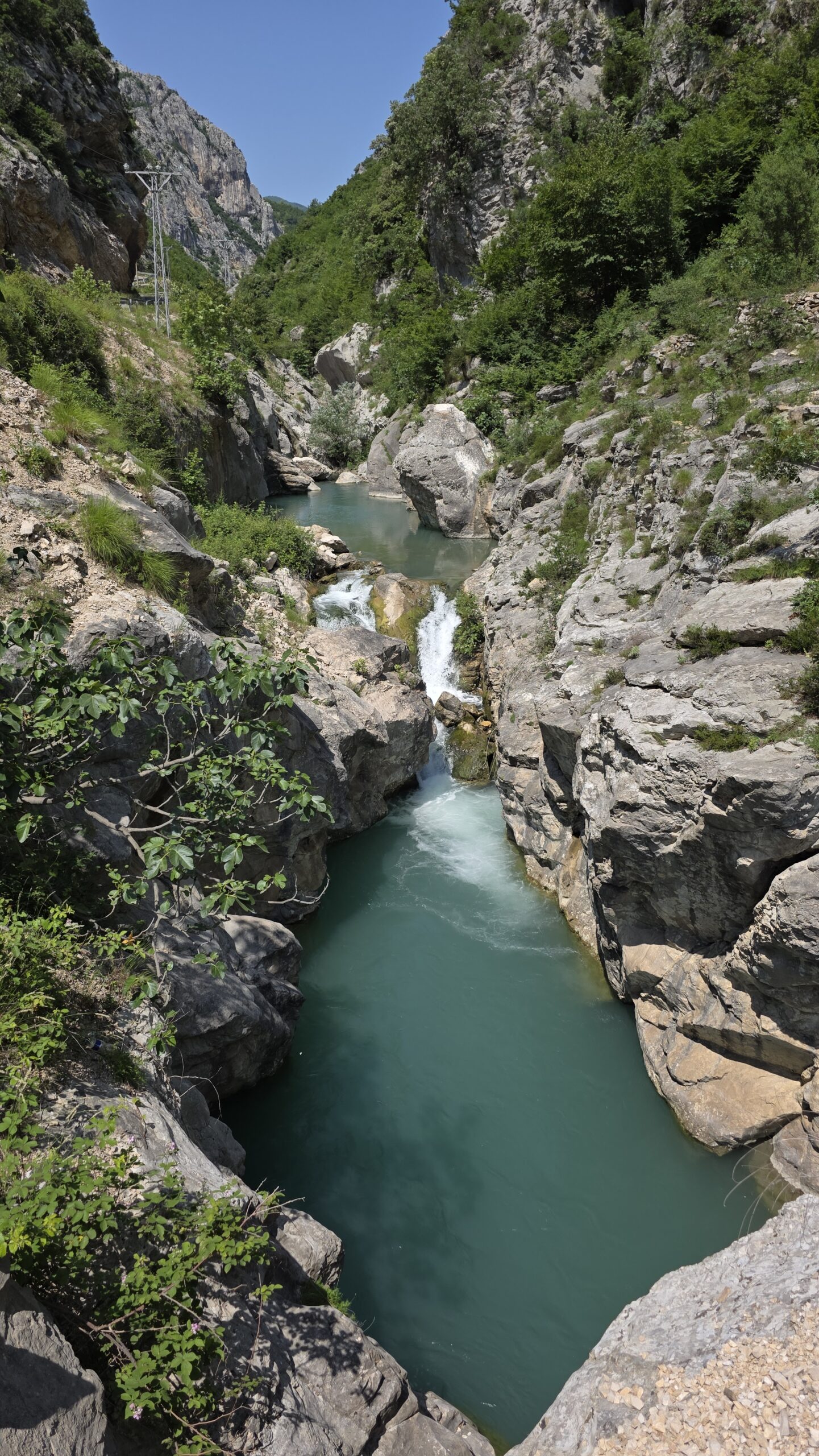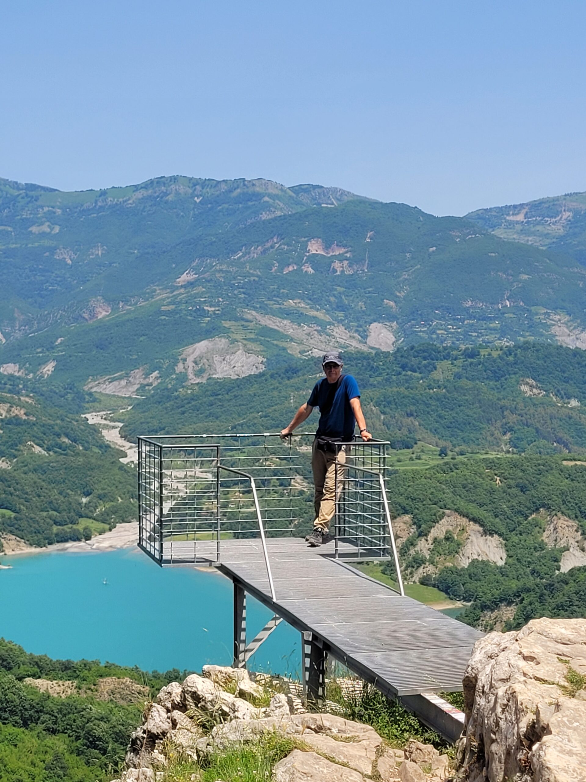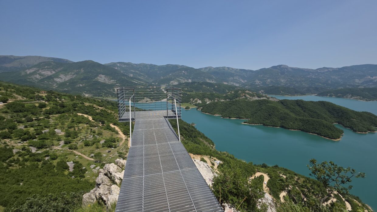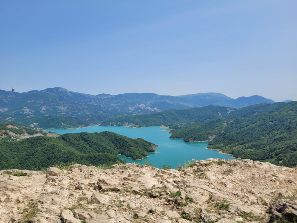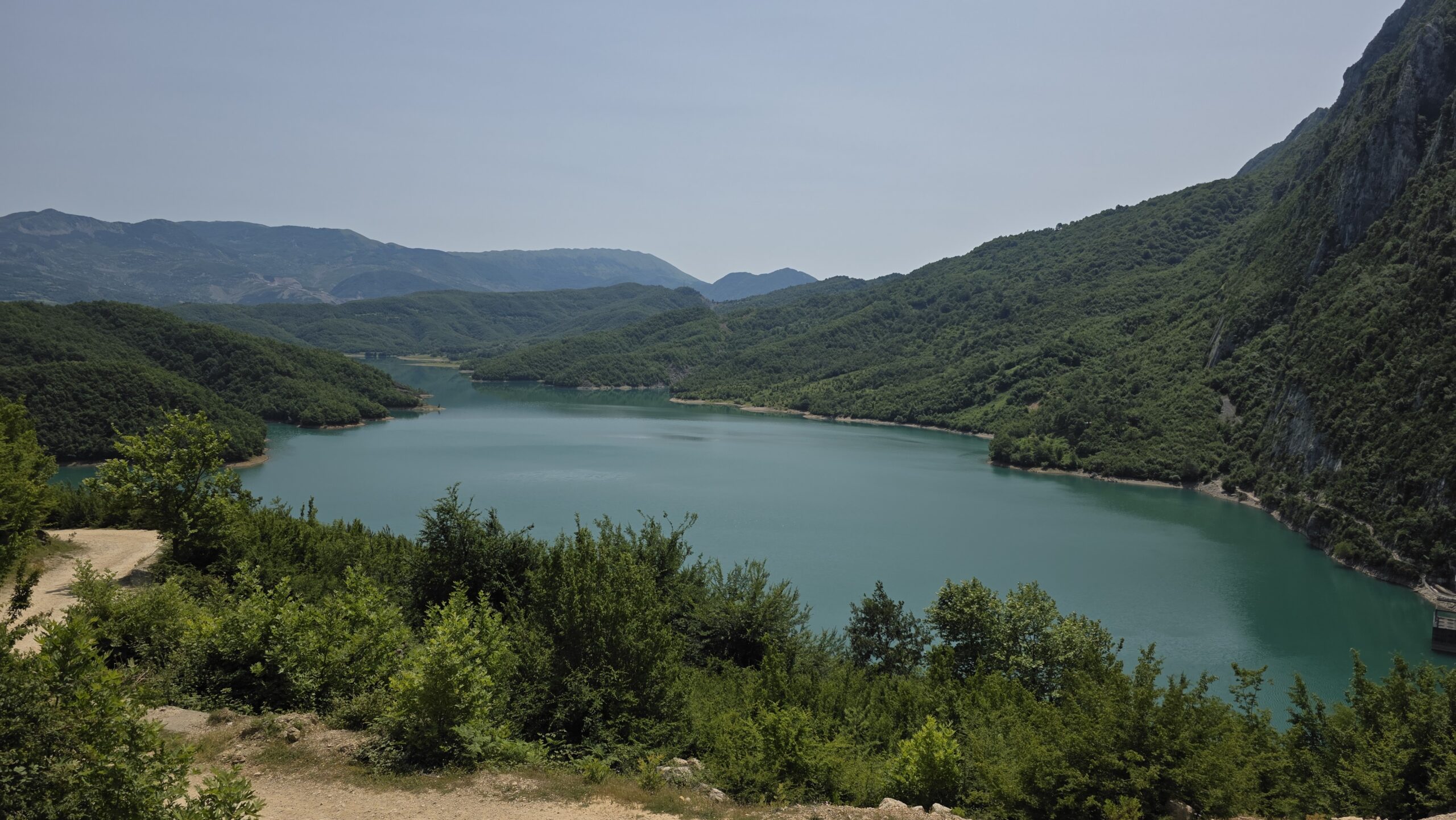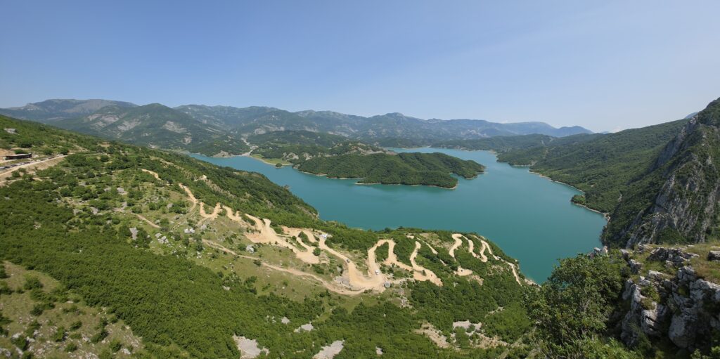 Vor uns breitet sich ein beeindruckendes Panorama aus: der tiefblaue Stausee, eingerahmt von majestätischen Bergen. Ein Moment zum Innehalten – auch wenn wir ihn nicht lange für uns allein haben.