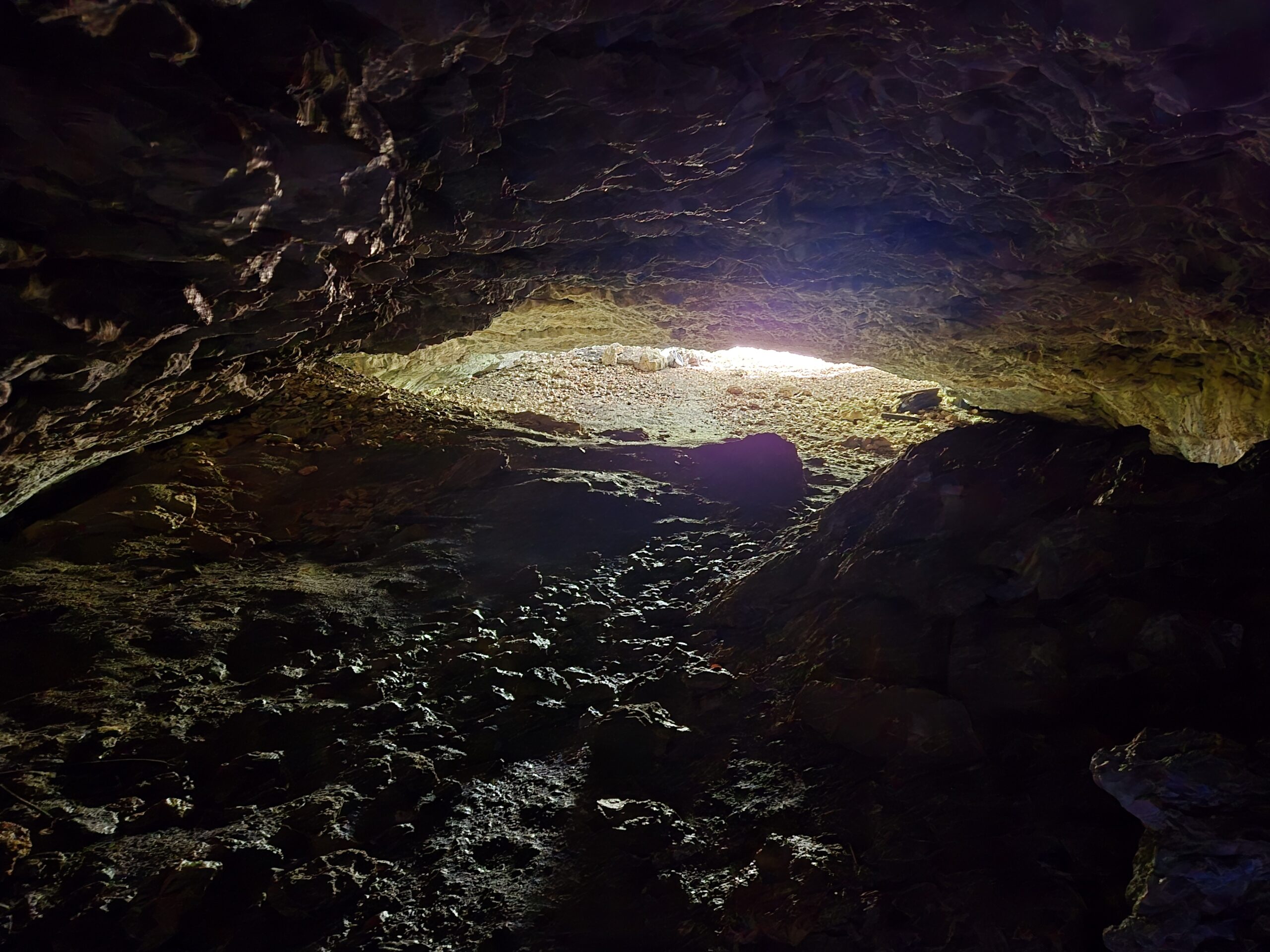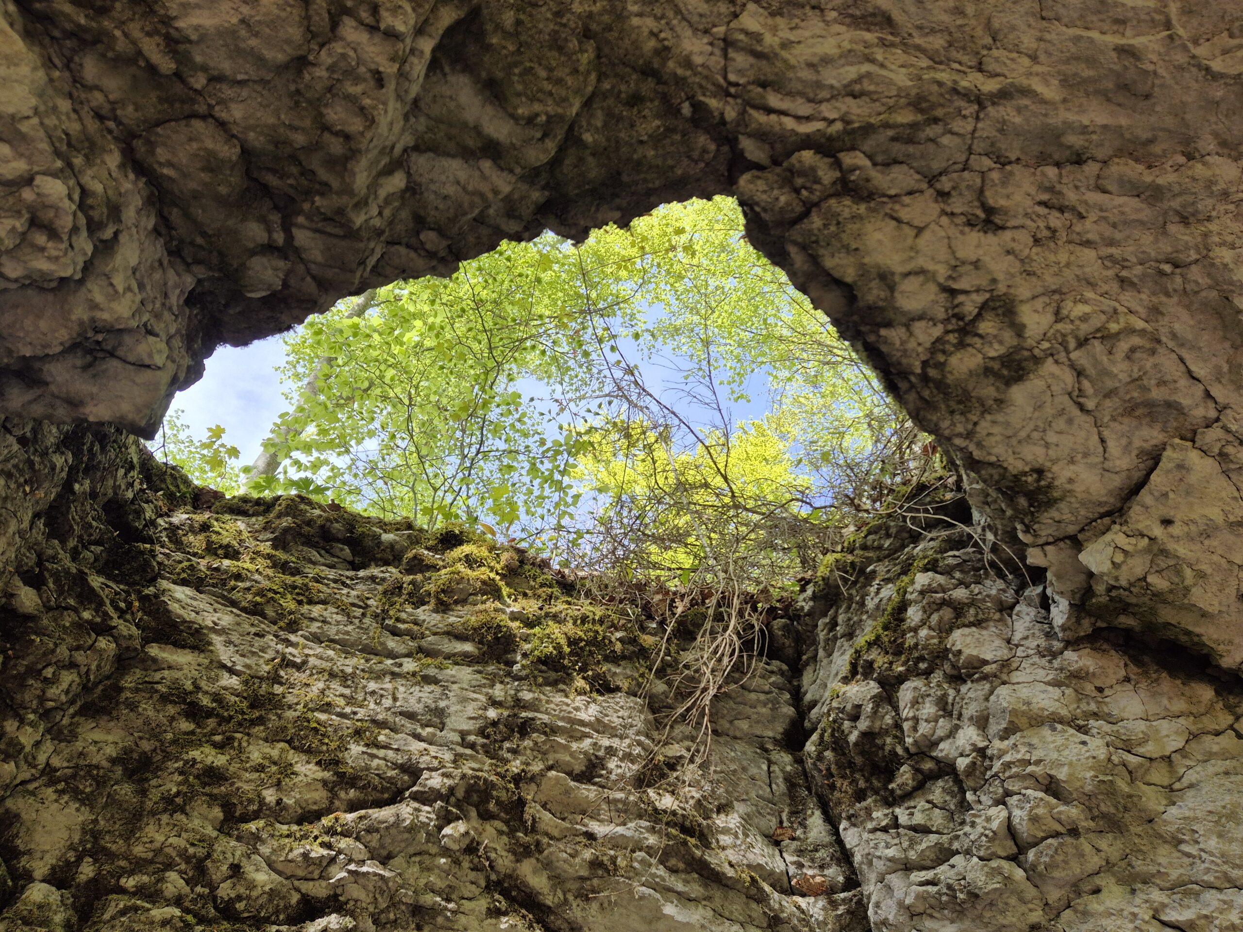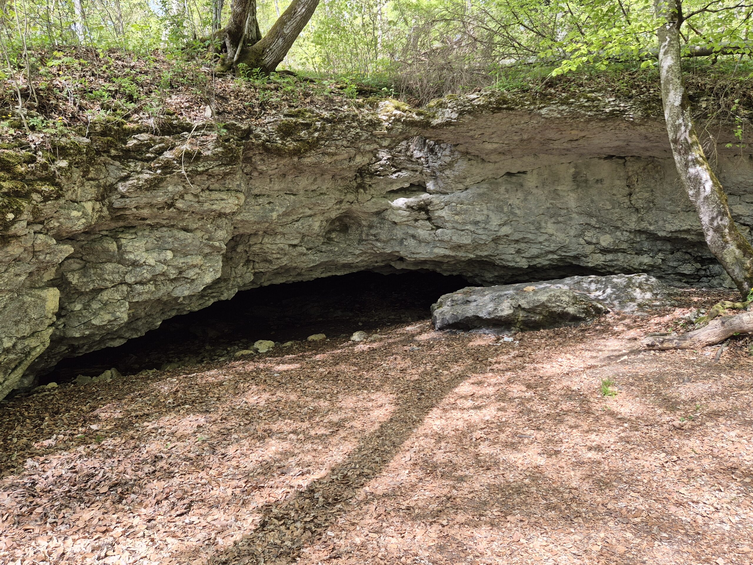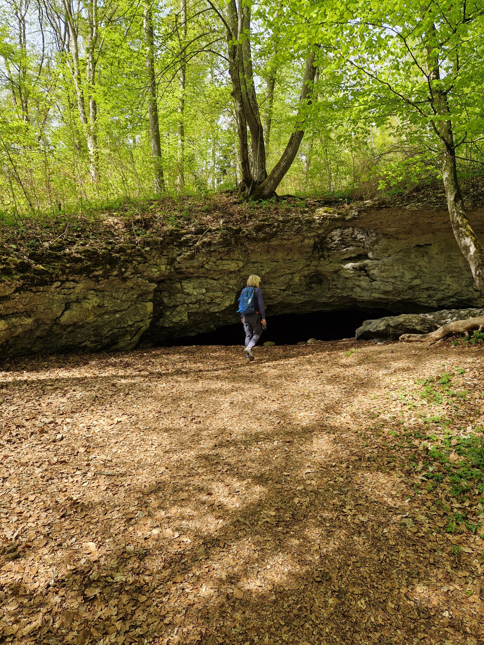 Wir gehen weiter zum Klarafelsen und kurz darauf zur Heidensteinhöhle. Im Winter wohnen hier Fledermäuse – heute haben wir die Höhle ganz für uns. Neugierig schauen wir uns um und entdecken kleine Tropfsteine an der Decke.