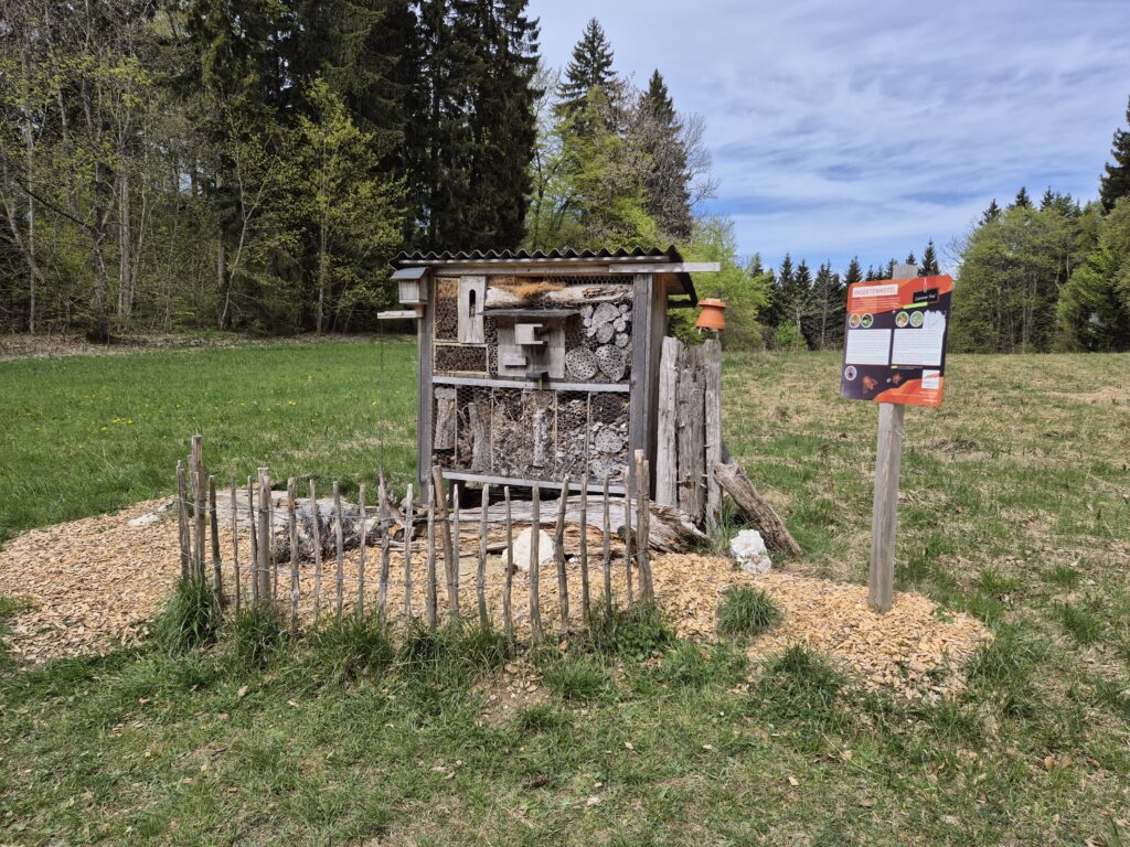 Unterwegs fallen uns die Insektenhotels und die Infotafeln am Wegesrand auf. Immer wieder öffnet sich der Wald und gibt neue Ausblicke frei – jedes Mal ein bisschen anders.