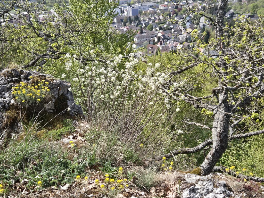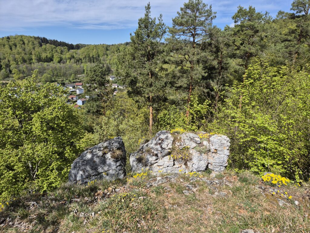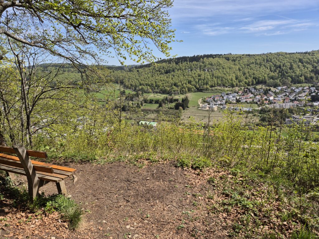 Gleich zu Beginn geht es über einen naturbelassenen, von Wurzeln durchzogenen Pfad leicht bergauf. Ich mag solche Wege – ein bisschen uneben, aber genau das macht den Reiz aus. Schon nach kurzer Zeit stehen wir am Schnecklesfelsen. Der Blick hinunter nach Albstadt und rüber zur Wacholderheide ist einfach herrlich.