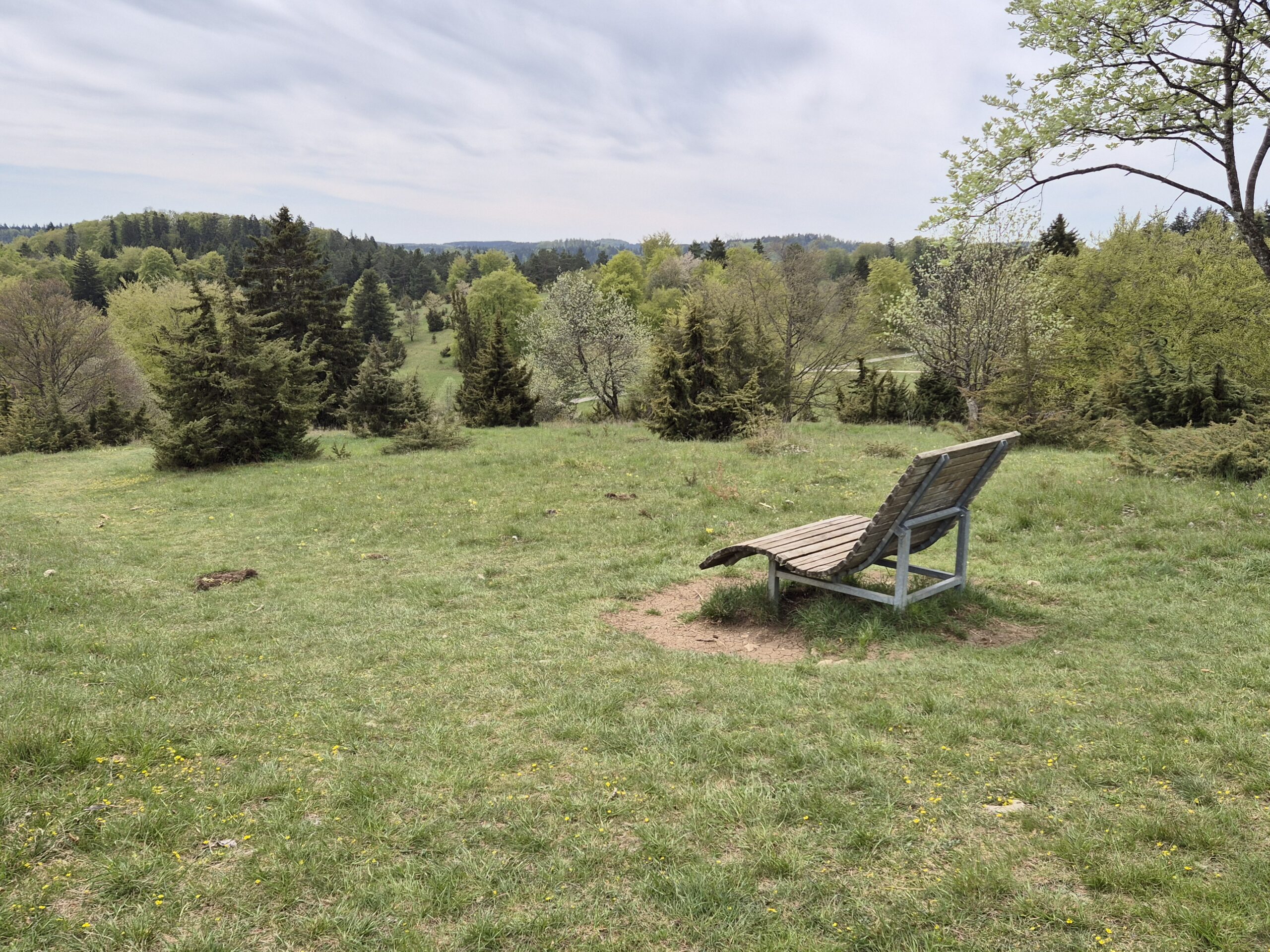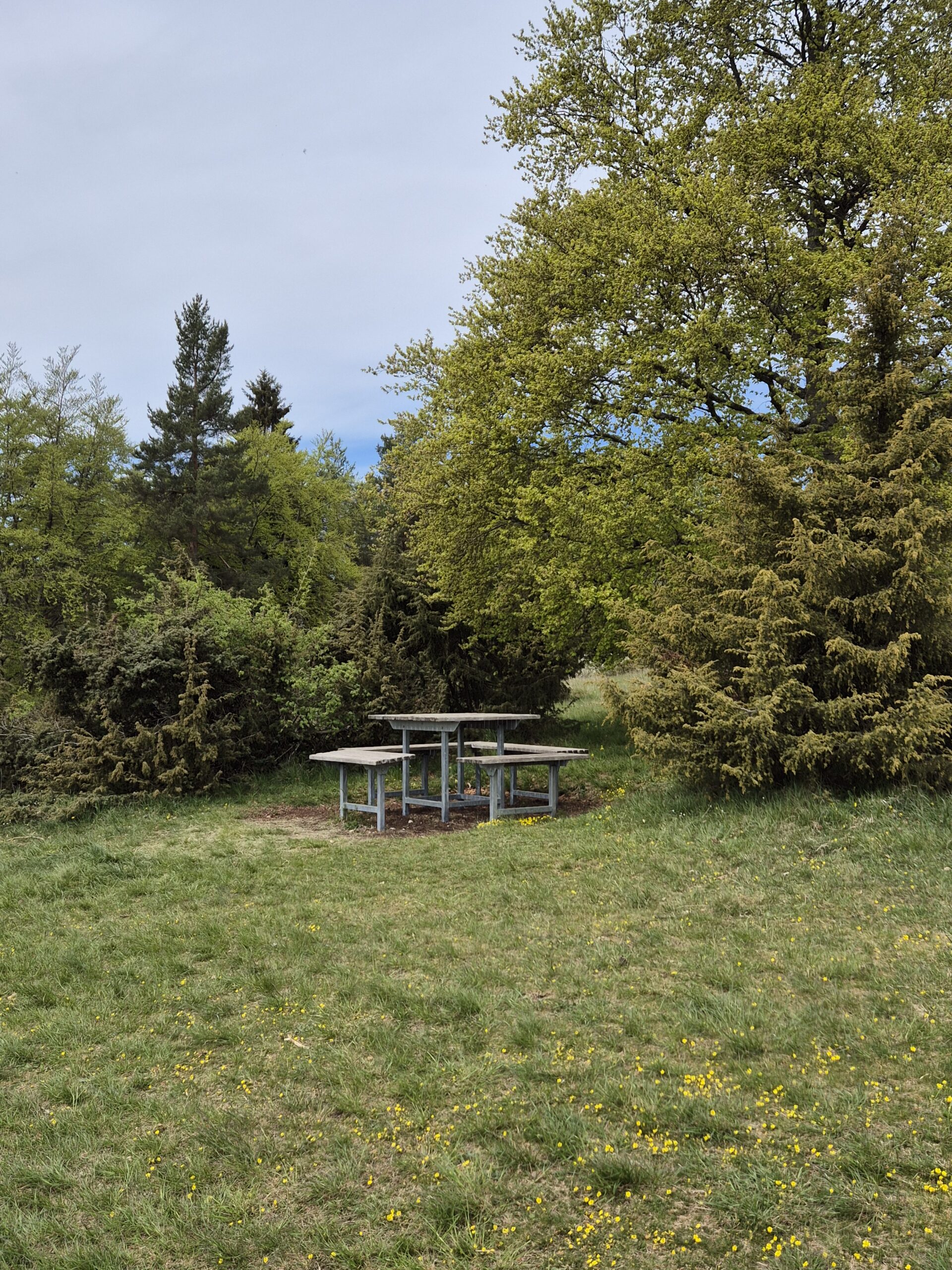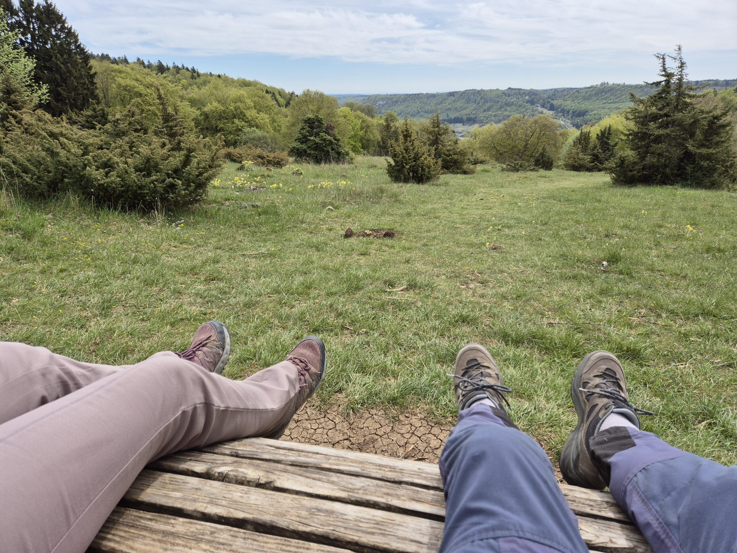 Am Grillplatz legen wir eine Pause ein. Es gibt Bänke und sogar Liegen – die lassen wir uns natürlich nicht entgehen. Wir strecken uns aus, genießen die Sonne und den Blick über die Wacholderheide. Ehrlich gesagt könnten wir hier ewig liegen bleiben… aber irgendwann geht es doch weiter.